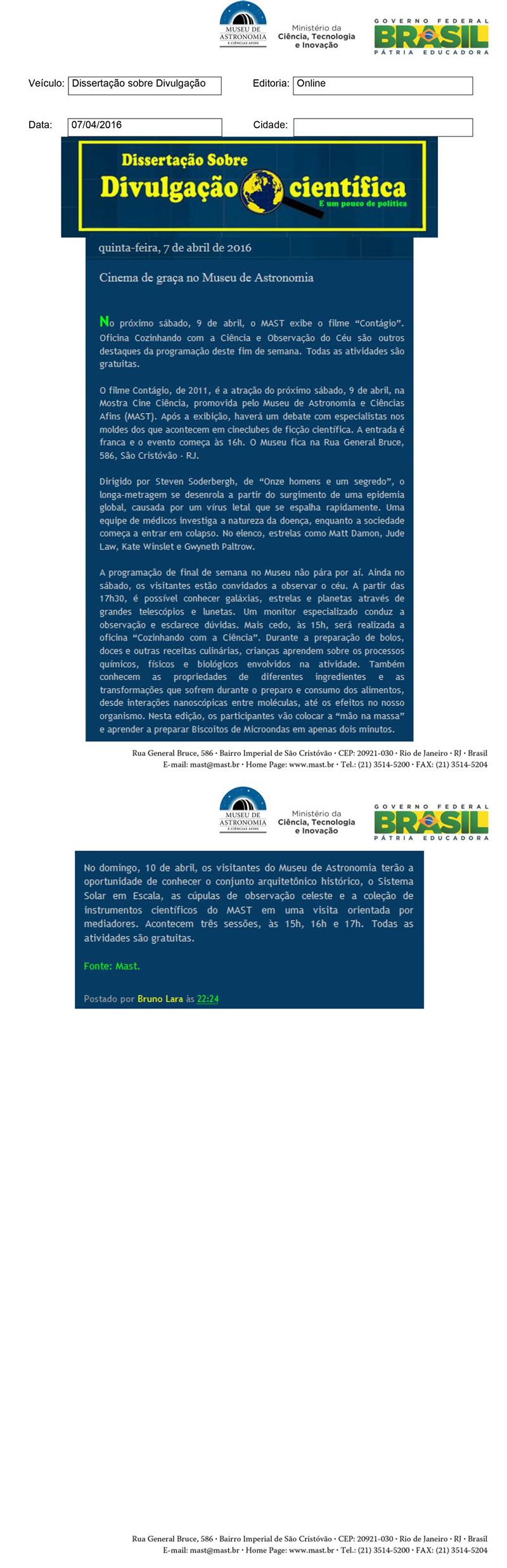 Dissertação sobre Divulgação | Cinema de graça no Museu de Astronomia