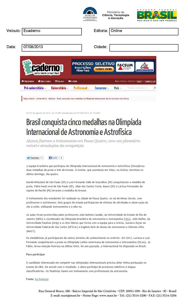 Ecaderno.com | Brasil conquista cinco medalhas na Olimpíada Internacional de Astronomia e Astrofísica