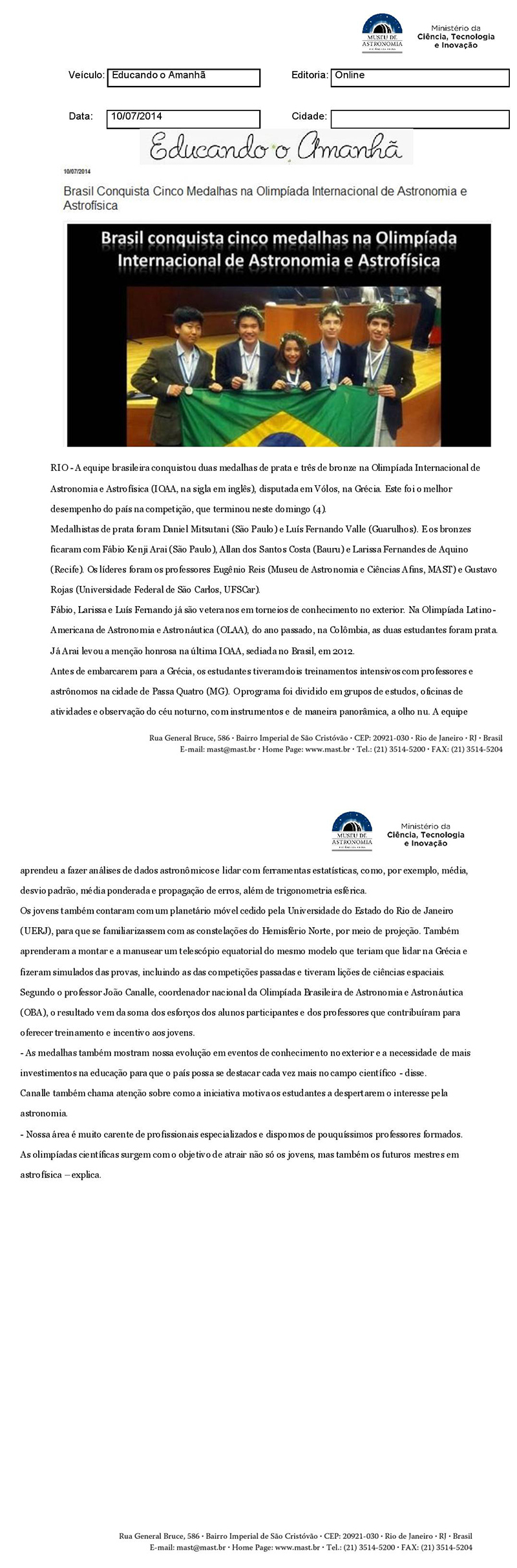 Educando o Amanhã | Brasil conquista cinco medalhas na Olimpíada Internacional de Astronomia e Astrofísica