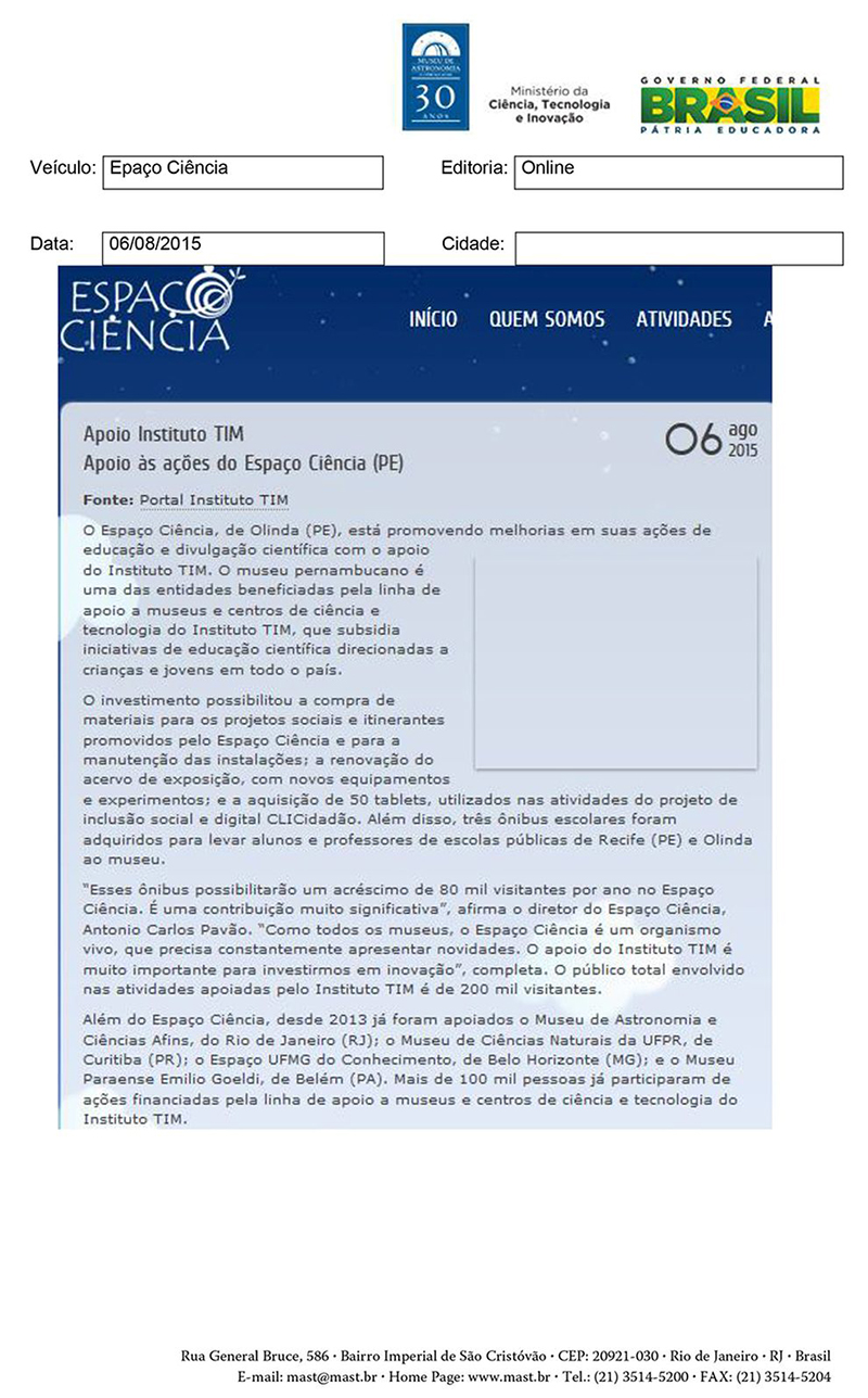 Espaço Ciência | Apoio às ações do Espaço Ciência (PE)