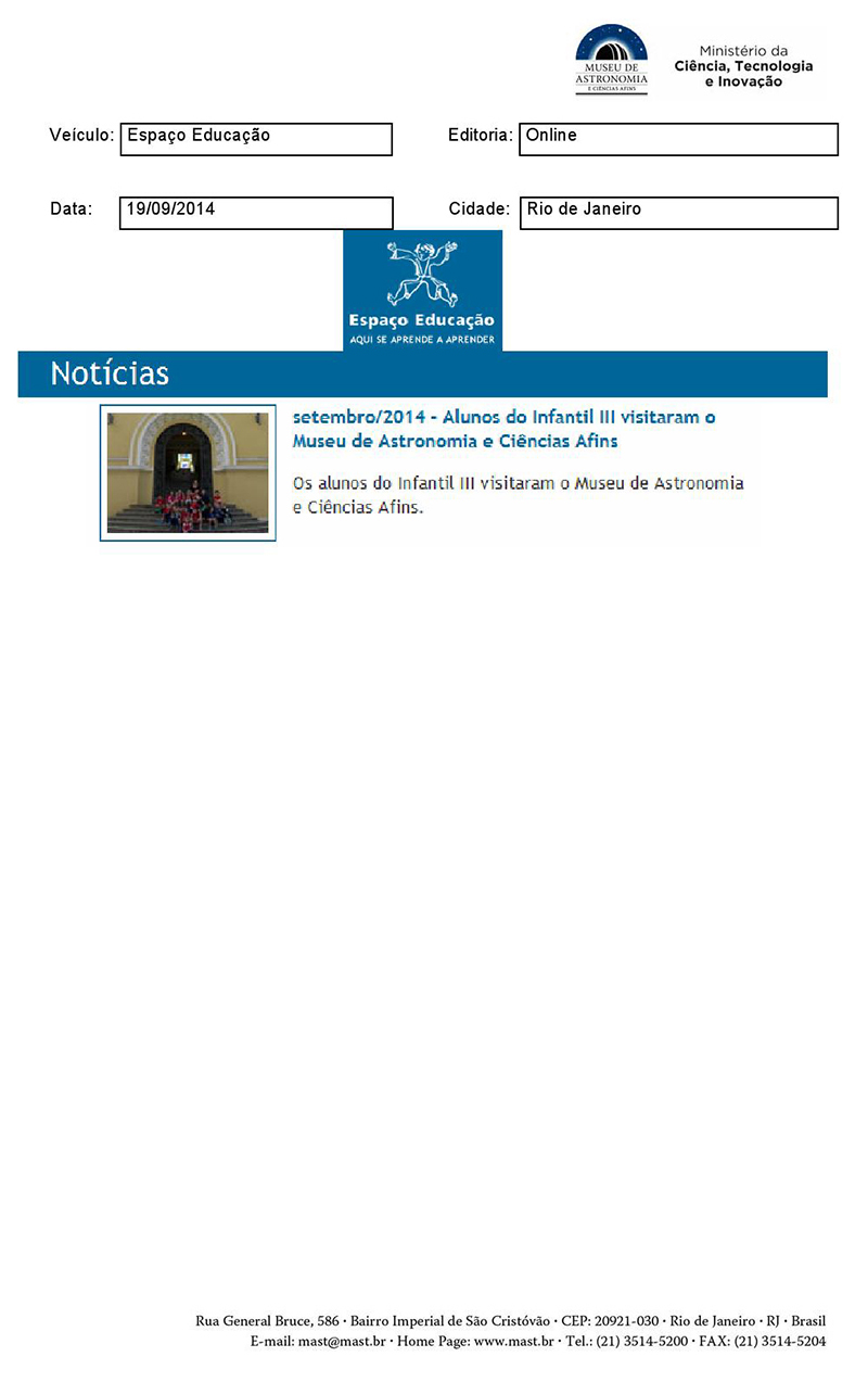 Espaço Educação | Alunos do infantil III visitaram o Museu de Astronomia e Ciências Afins