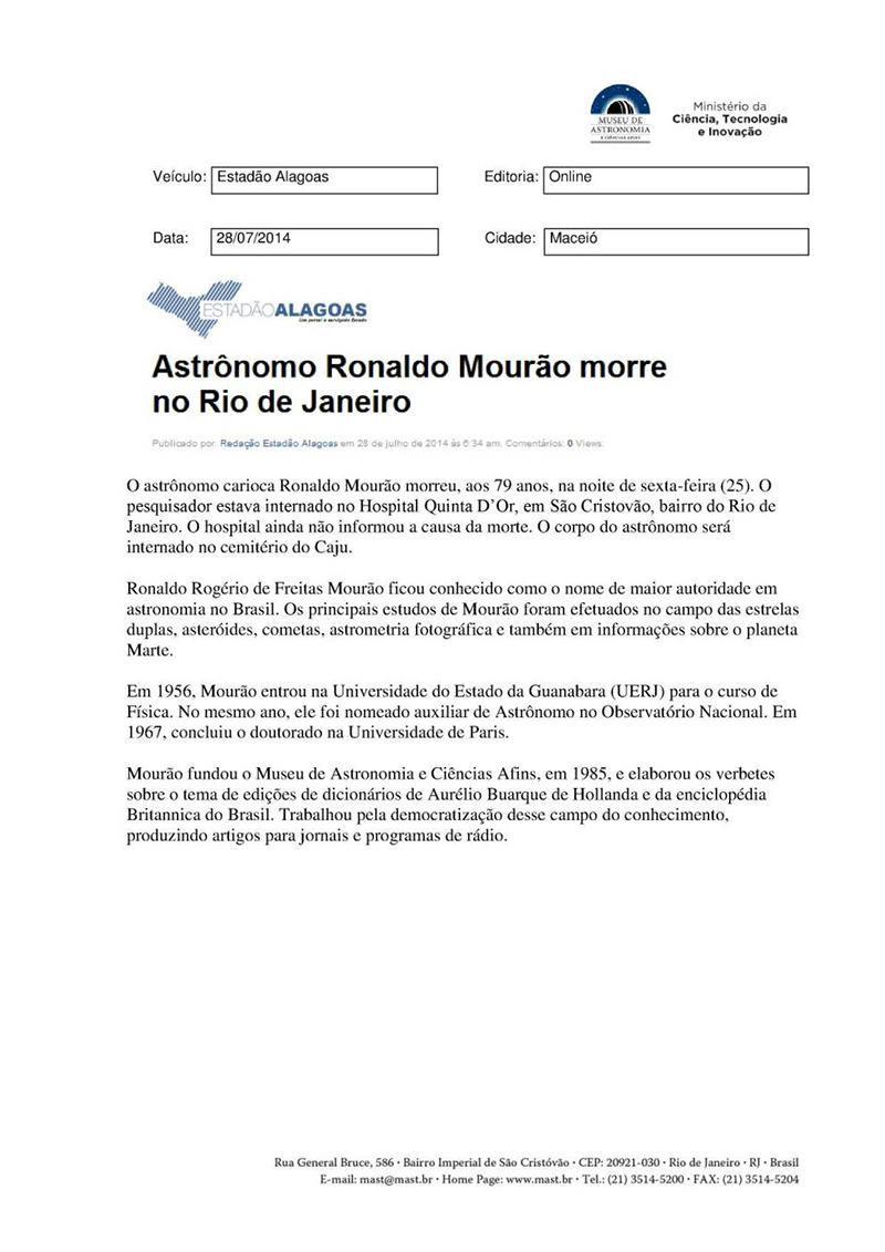 Estadão Alagoas | Astrônomo Ronaldo Mourão morre no Rio de Janeiro