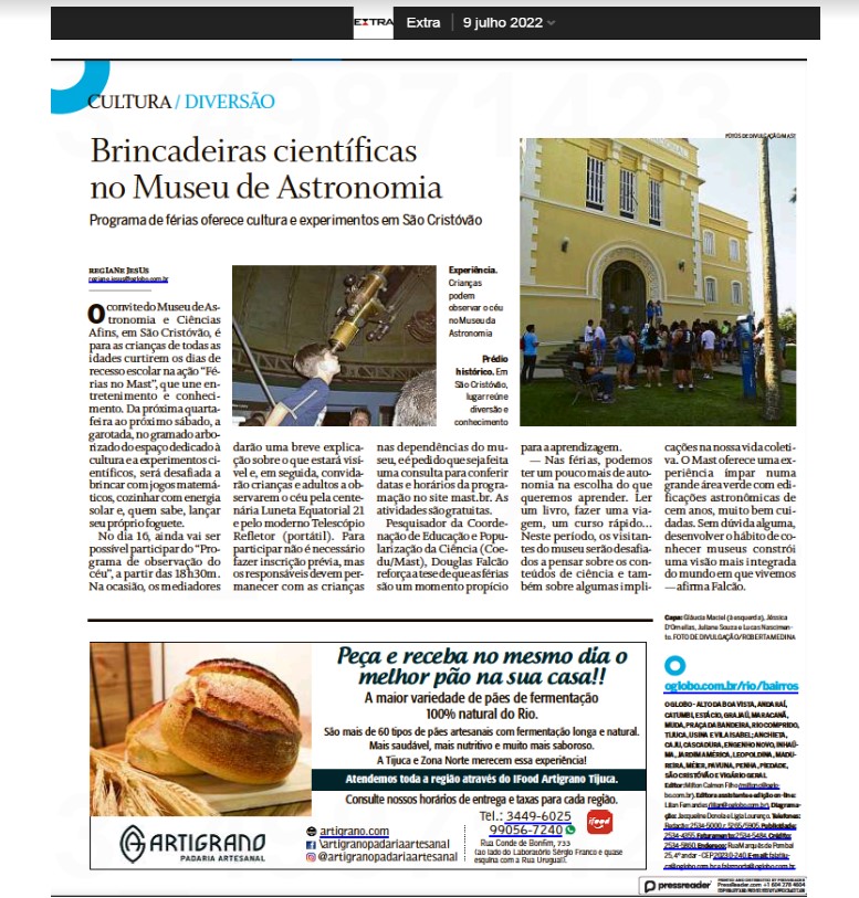 Extra / O Globo Tijuca + Zona Norte - Férias no MAST na reportagem "Brincadeiras científicas no Museu de Astronomia"