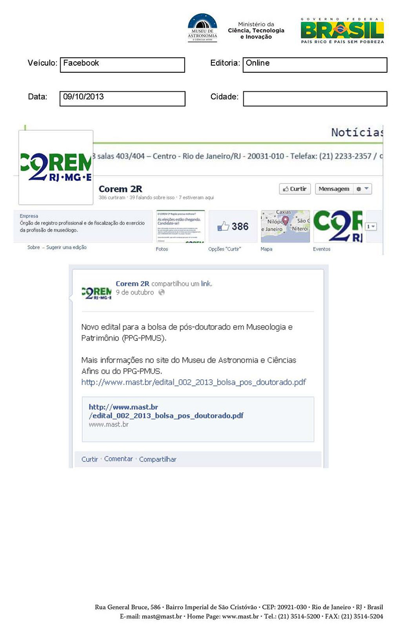 Facebook | Novo edital para a bolsa de pós-graduação em Museologia e Patrimônio
