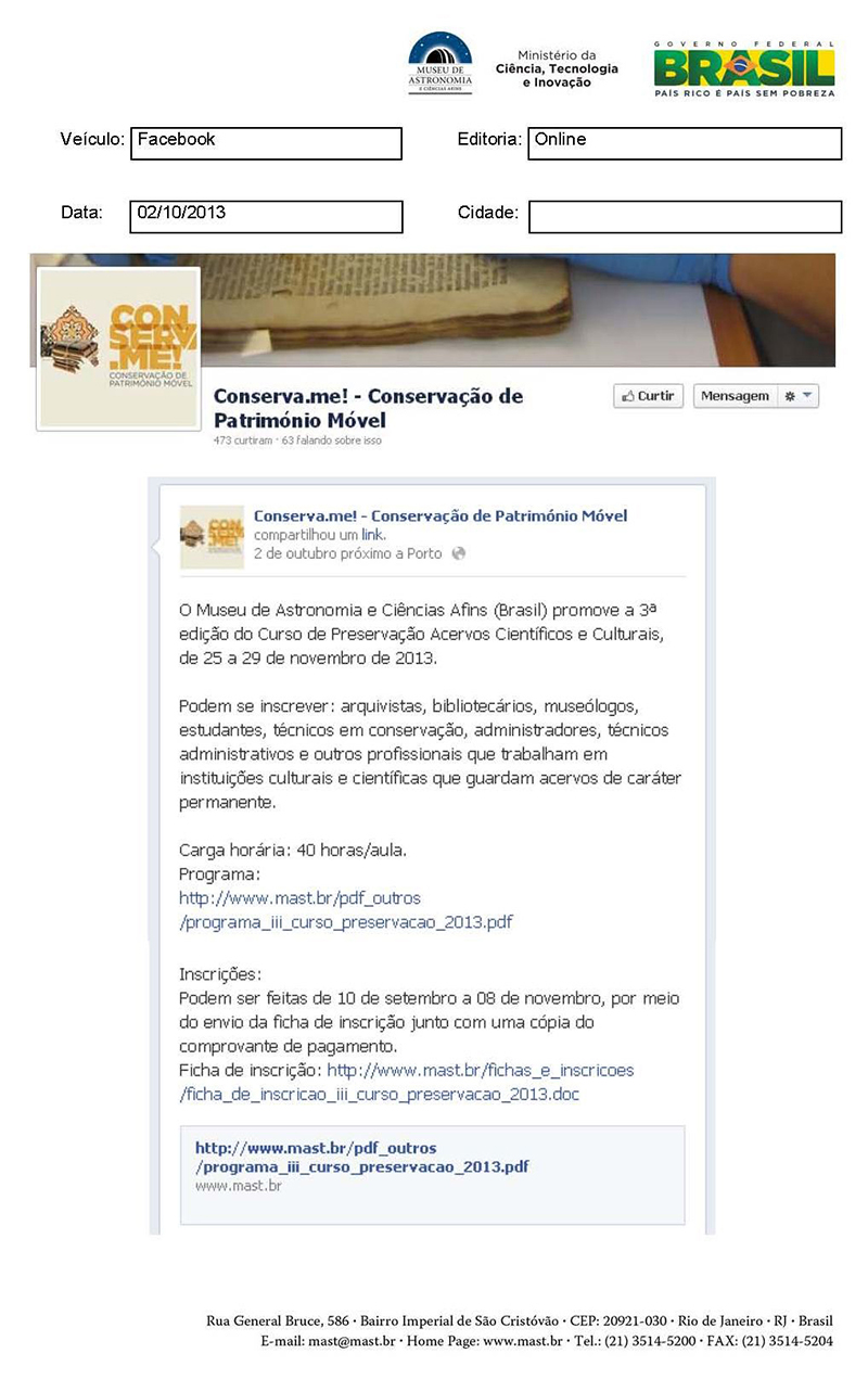 Facebook | O Museu de Astronomia e Ciências Afins promove a 3ª edição do Curso de Preservação Acervos Científicos e Culturais