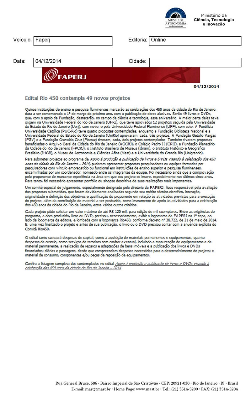 FAPERJ | Edital Rio 450 contempla 49 novos projetos