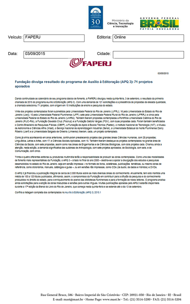 FAPERJ | Fundação divulga resultado do programa de Auxílio à Editoração (APQ3): 71 projetos apoiados