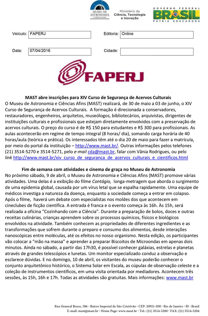 FAPERJ | MAST abre inscrições para XIV Curso de Seguança de Acervos Culturais