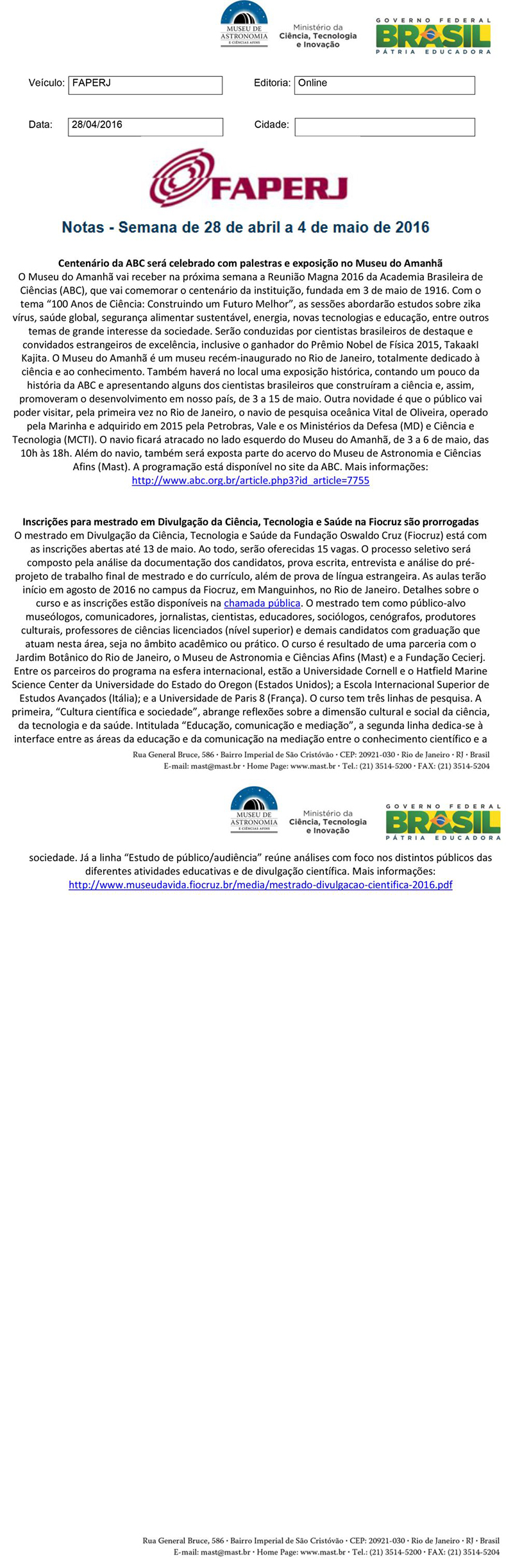 FAPERJ | Semana de 28 de abril a 4 de maio de 2016