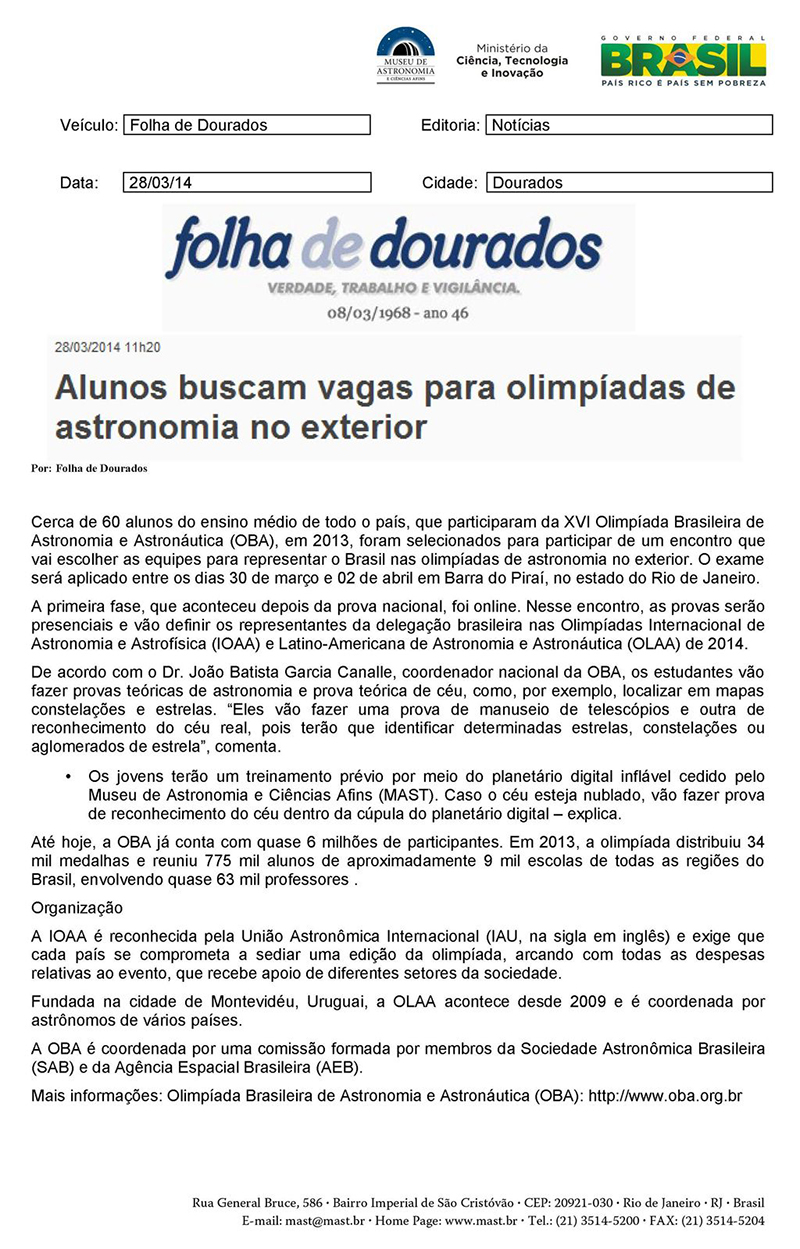 Folha de Dourados | Alunos buscam vagas para olimpíadas de astronomia no exterior