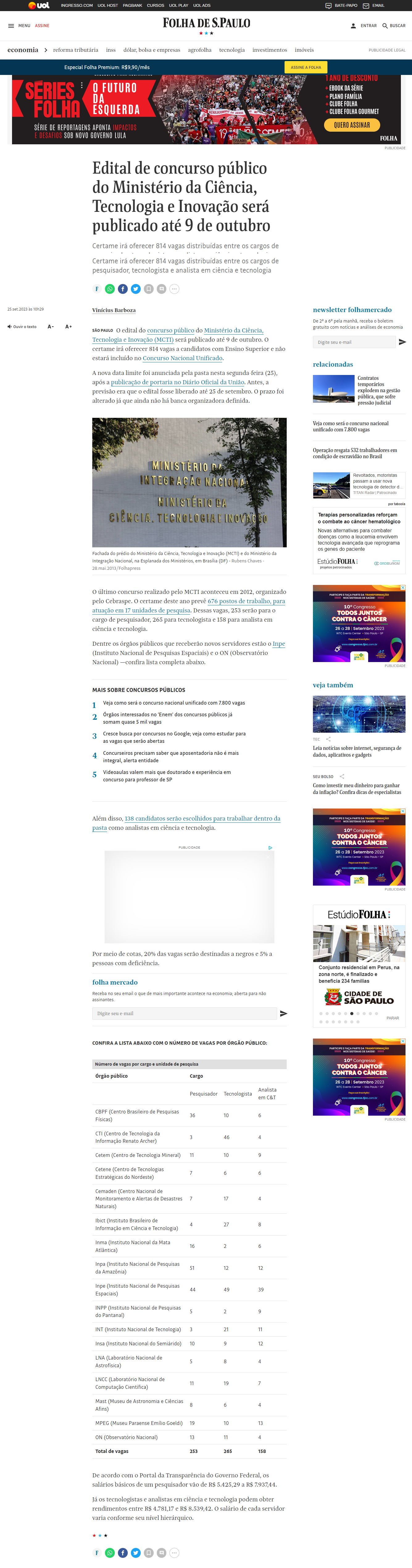 Folha de S. Paulo - Edital de concurso público do Ministério da Ciência, Tecnologia e Inovação será publicado até 9 de outubro