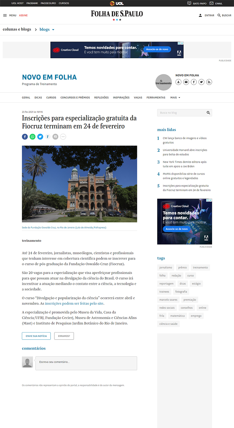 Folha de São Paulo / Blogue 'Novo em Folha' | MAST no curso Divulgação e popularização da ciência