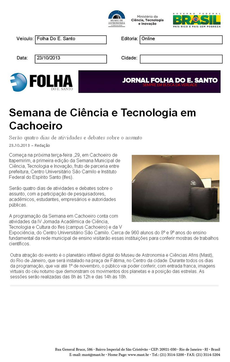 Folha do E. Santo | Semana de Ciência e Tecnologia vai mobilizar Cachoeiro