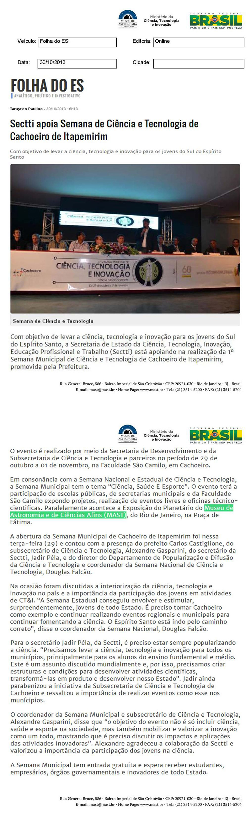 Folha do ES | Sectti apoia Semana de Ciência e Tecnologia de Cachoeiro de Itapemirim
