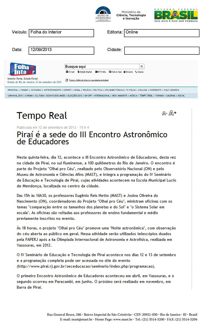 Folha do Interior | Piraí é a sede do III Encontro Astronômico de Educadores