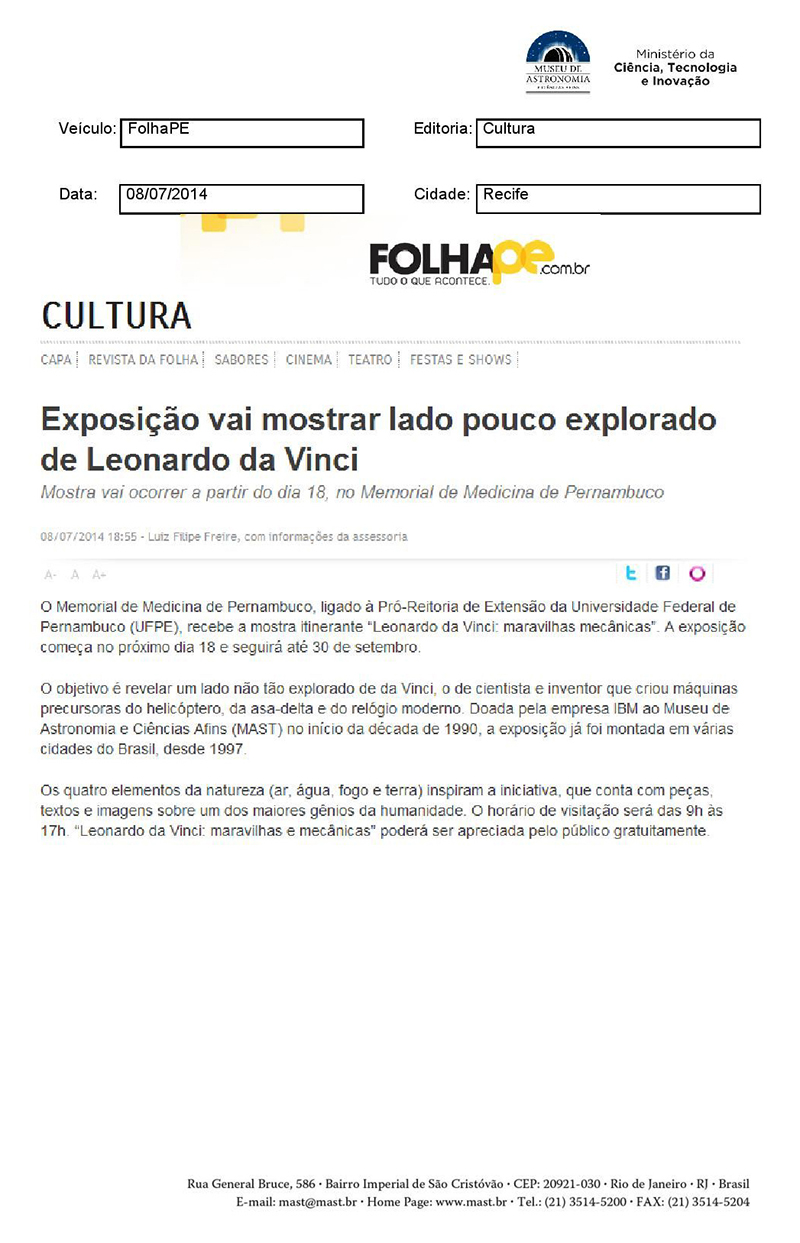 FolhaPE | Exposição vai mostrar lado pouco explorado de Leonardo da Vinci