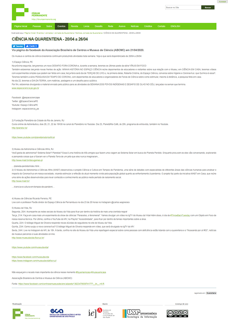 Fórum Permanente (site) | MAST lança série de vídeos Ciência e Cultura em Tempos de Pandemia