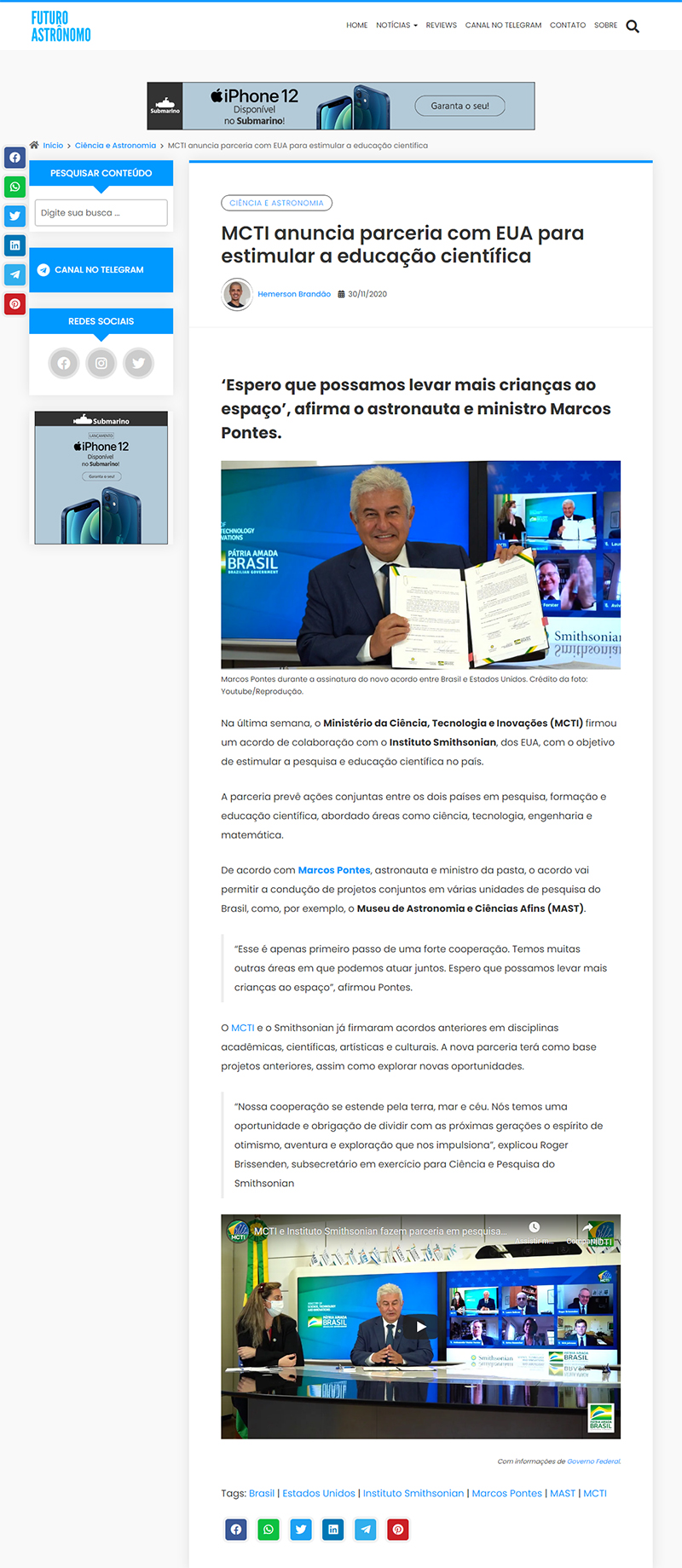 Futuro Astrônomo (site) | MAST na reportagem "MCTI anuncia parceria com EUA para estimular a educação científica"