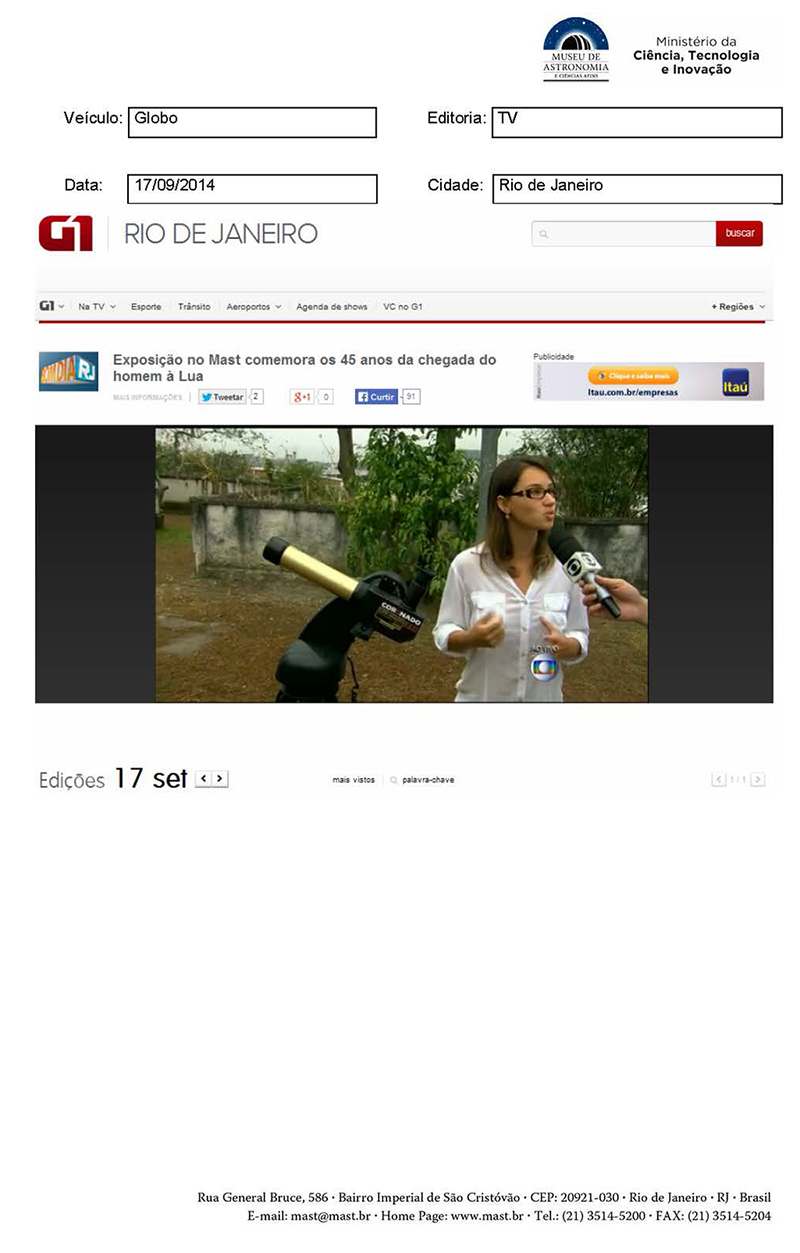 G1 | Exposição no MAST comemora os 45 anos da chegada do homem à Lua