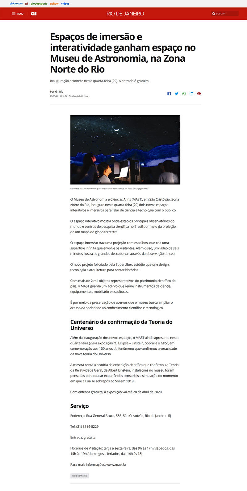 G1 - Rio de Janeiro | Espaços de imersão e interatividade ganham espaço no Museu de Astronomia, na Zona Norte do Rio