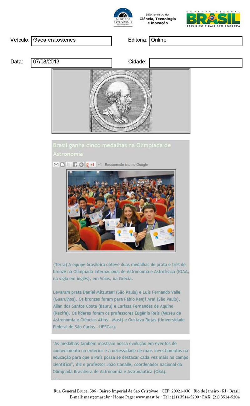 GAEA | Brasil ganha cinco medalhas na Olimpíada de Astronomia