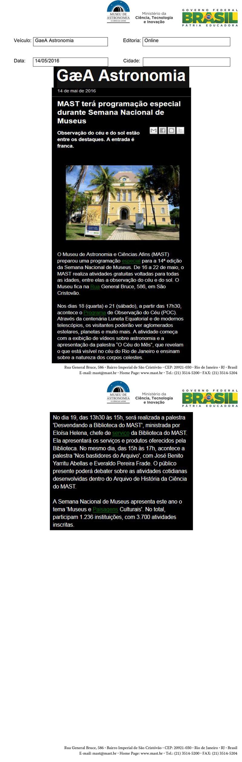 GAEA | MAST terá programação especial durante Semana Nacional de Museus