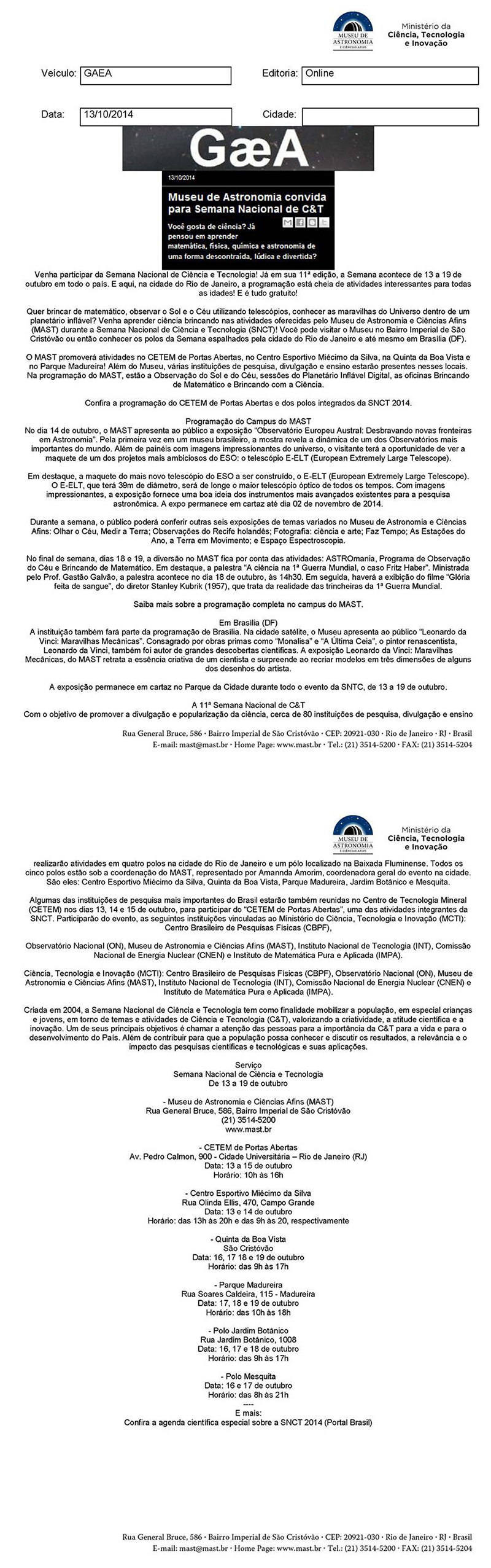GAEA | Museu de Astronomia convida para Semana Nacional de C&T