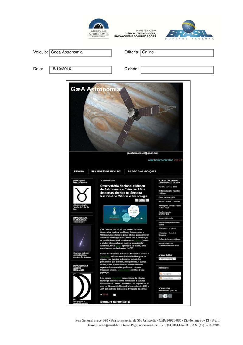 GAEA | Observatório Nacional e Museu de Astronomia e Ciências Afins de portas abertas na Semana Nacional de Ciência e Tecnologia