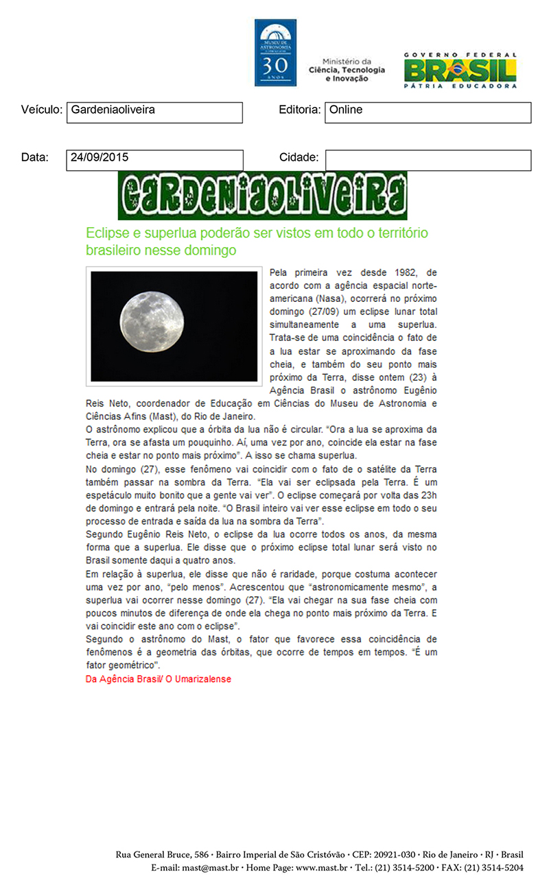 Gardeniaoliveira | Eclipse e superlua poderão ser vistos em todo o território brasileiro nesse domingo
