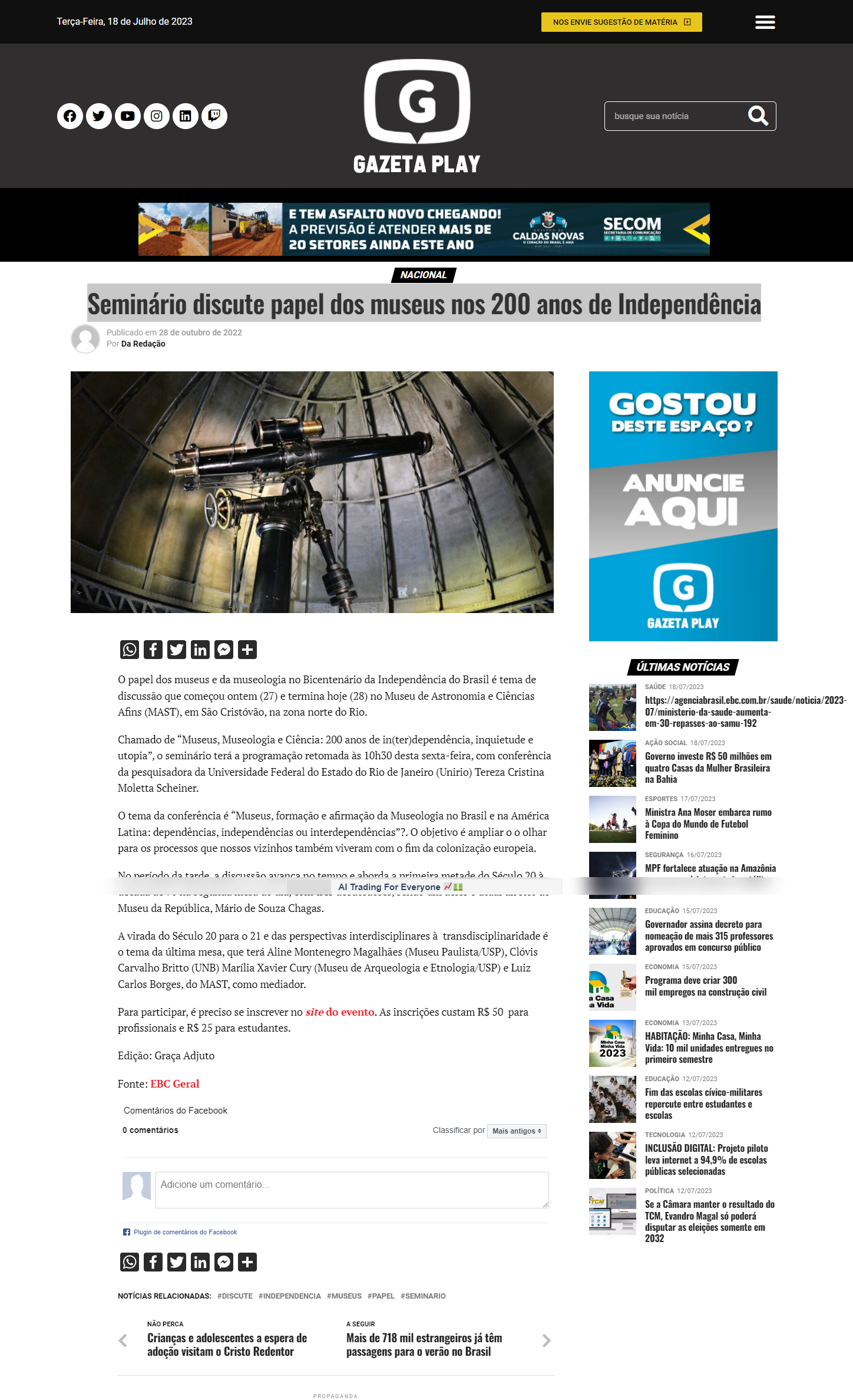 Gazeta Play - Seminário discute papel dos museus nos 200 anos de Independência