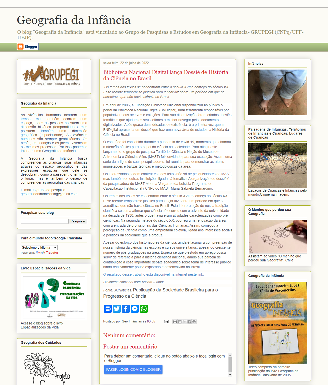 Geografia da Infância (blogue) - MAST participa da criação do dossiê de História da Ciência para a Biblioteca Nacional