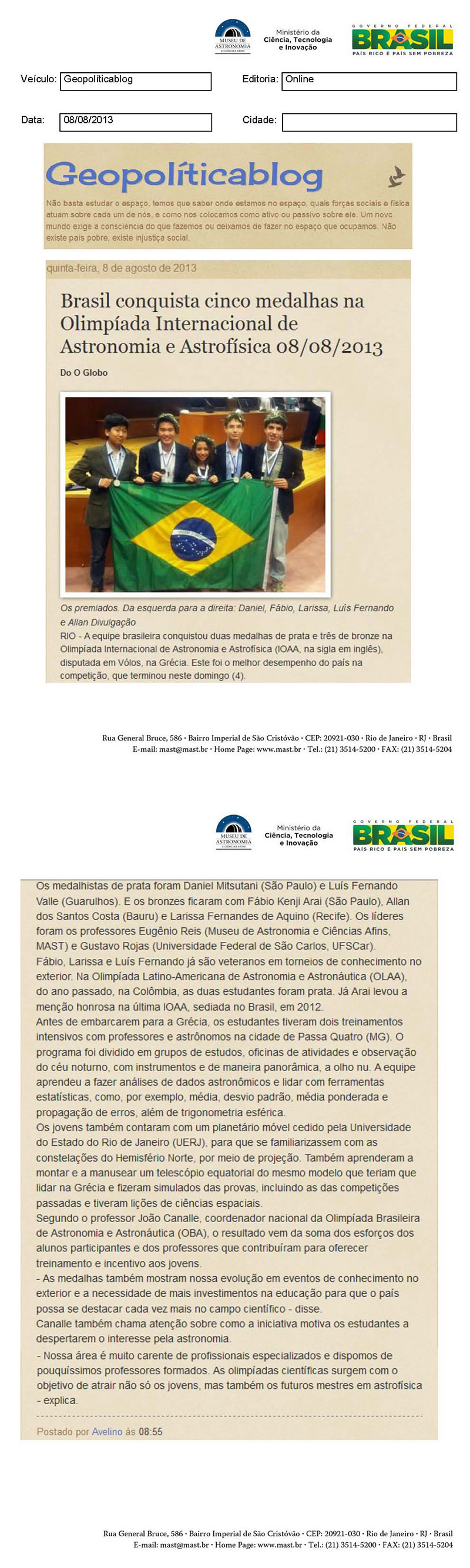 Geopolíticablog | Brasil conquista cinco medalhas na Olimpíada Internacional de Astronomia e Astrofísica
