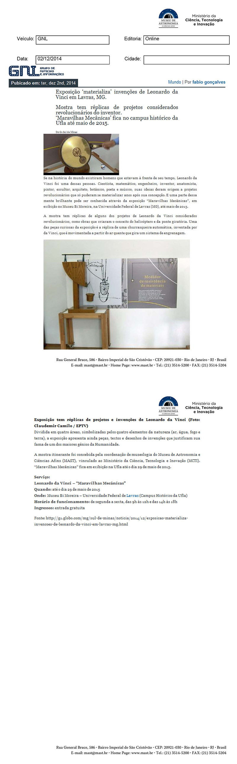 GNL | Exposição 'materializa' invenções de leonardo da Vinci em Lavras, MG