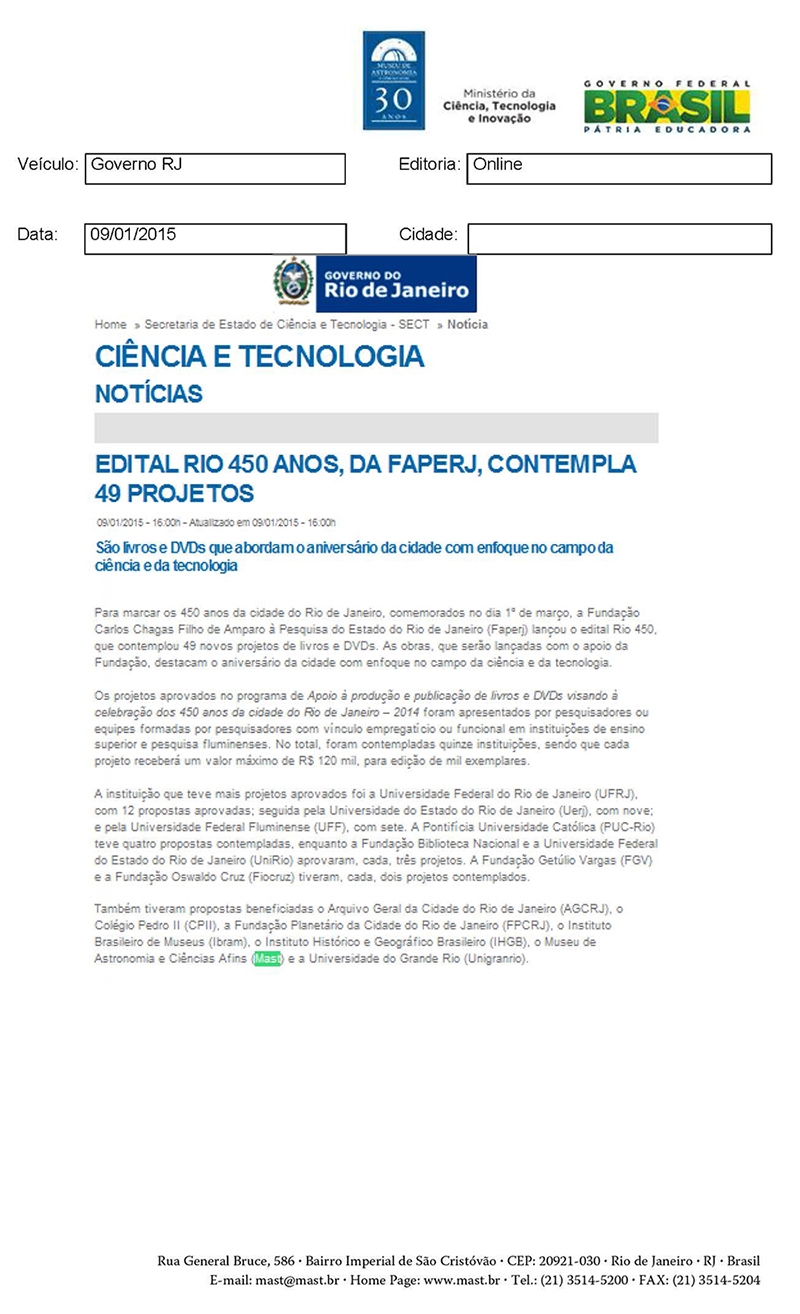 Governo RJ | Edital Rio 450 anos, da FAPERJ, contempla 49 projetos
