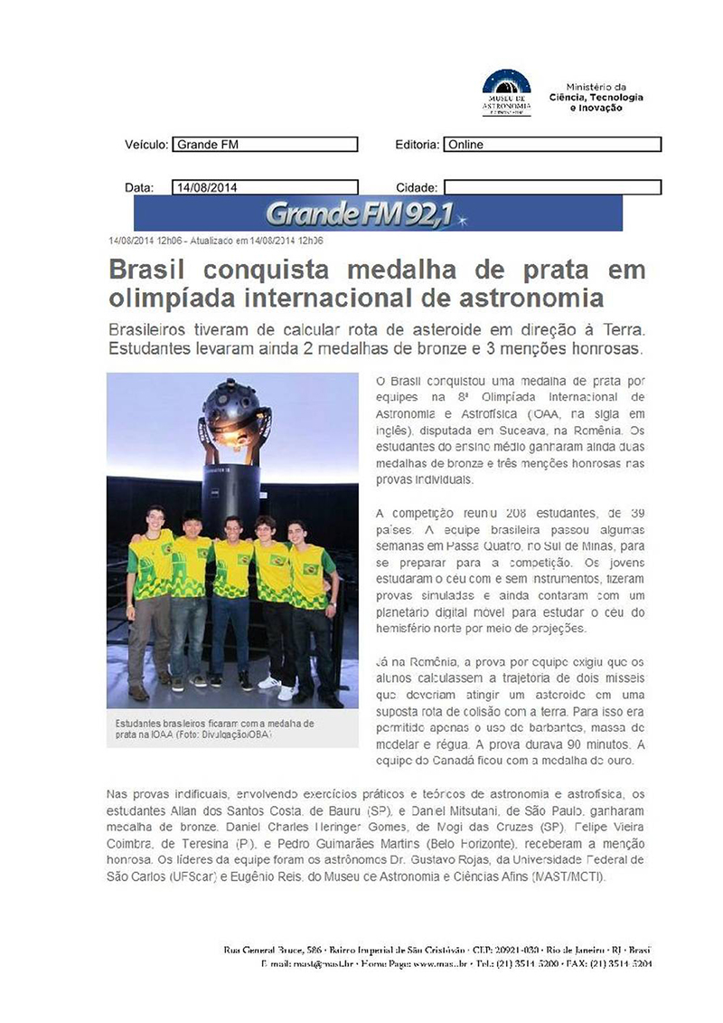 Grande FM | Brasil conquista medalha inédita em olimpíada internacional de astronomia