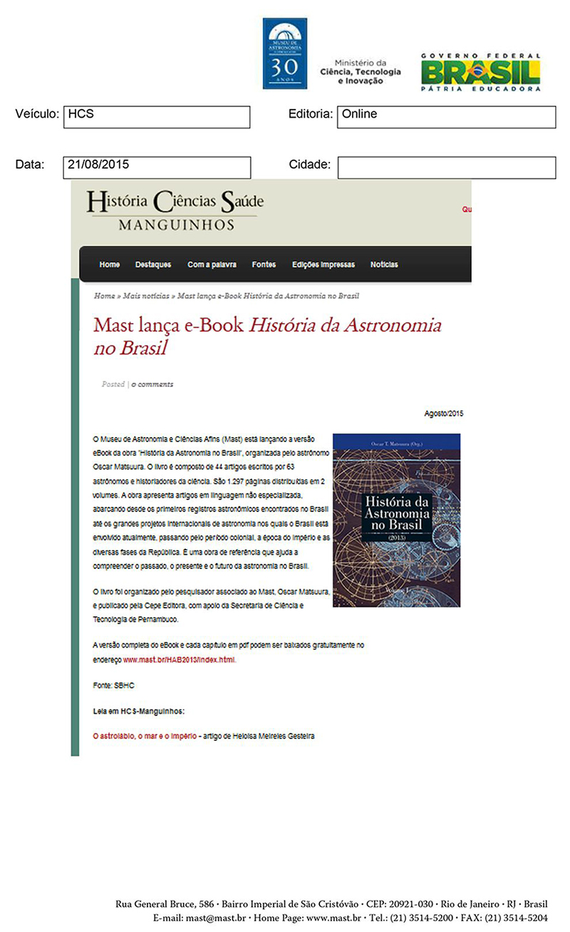 HCS | MAST lança e-Book História da Astronomia no Brasil