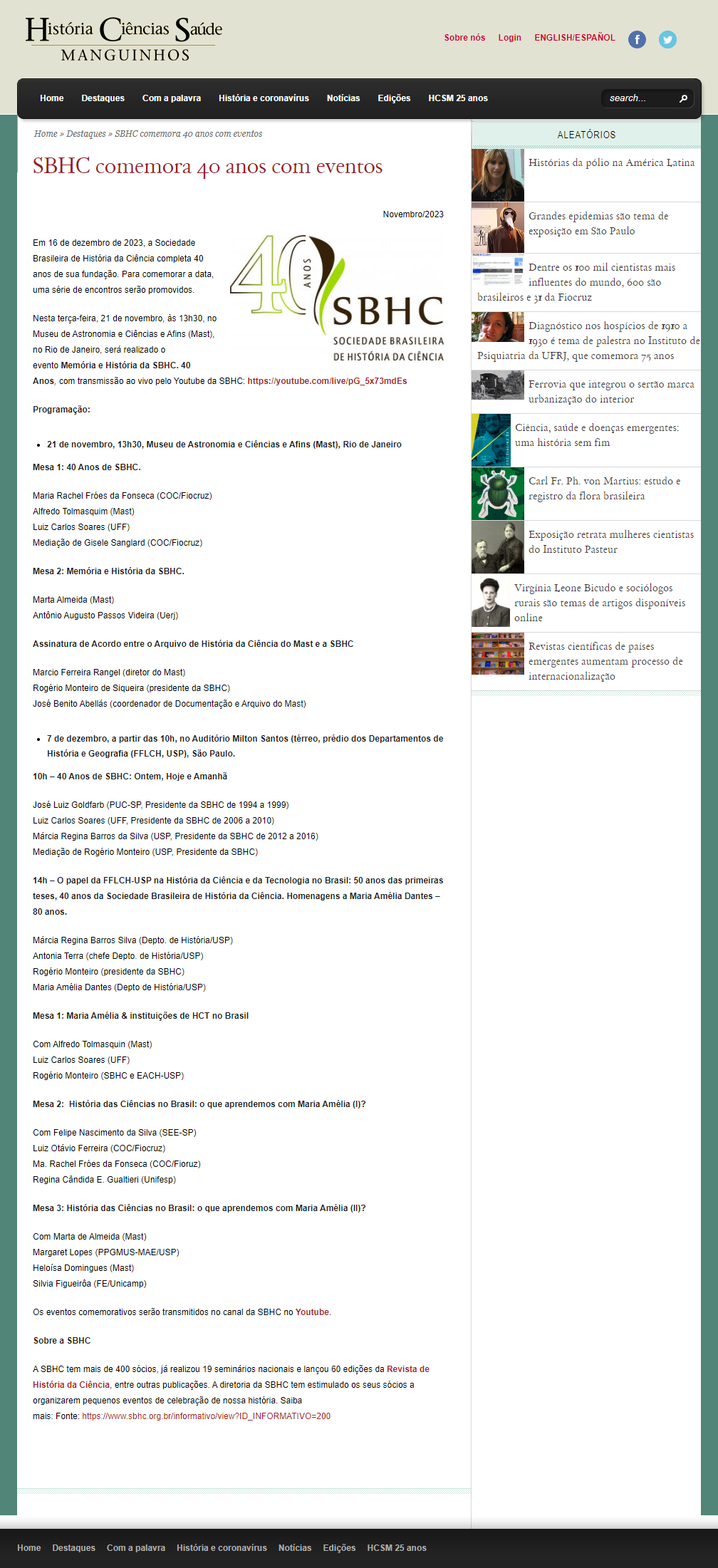 História Ciências Saúde - SBHC comemora 40 anos com eventos