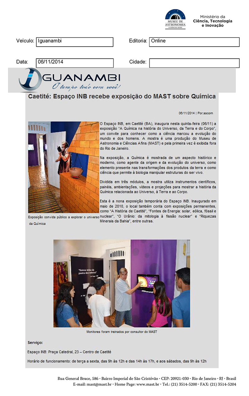 Iguanambi | Caetité: Espaço INB recebe exposição do MAST sobre Química