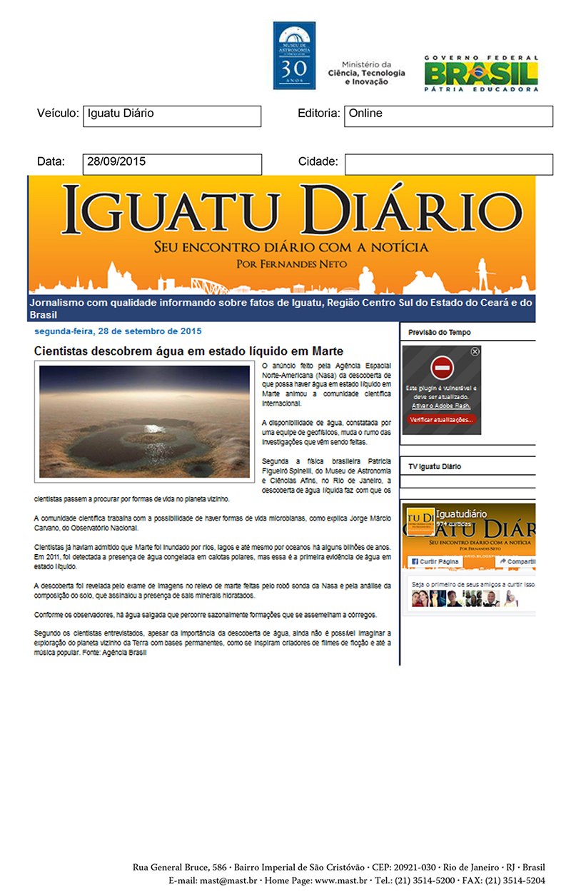 Iguatu Diário | Cientistas descobrem água em estado liquido em Marte