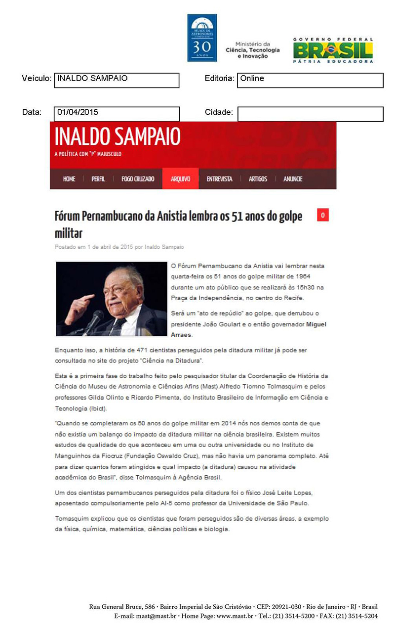 Inaldo Sampaio | Fórum Pernambucano da Anistia lembra os 51 anos do golpe militar