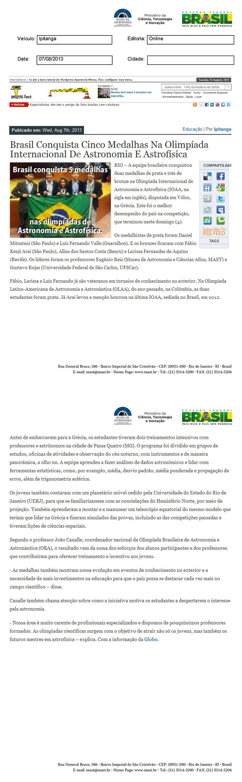 Ipitanga | Brasil conquista cinco medalhas na Olimpíada Internacional de Astronomia e Astrofísica