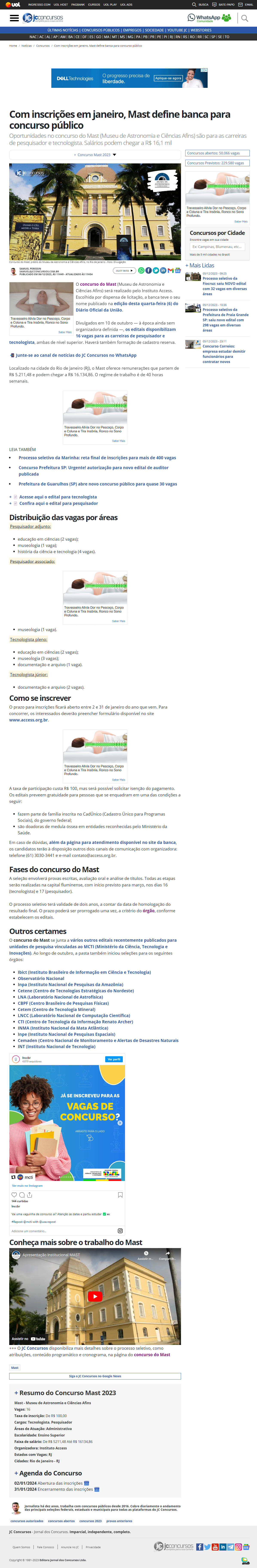 JC Concursos - Com inscrições em janeiro, MAST define banca para concurso público