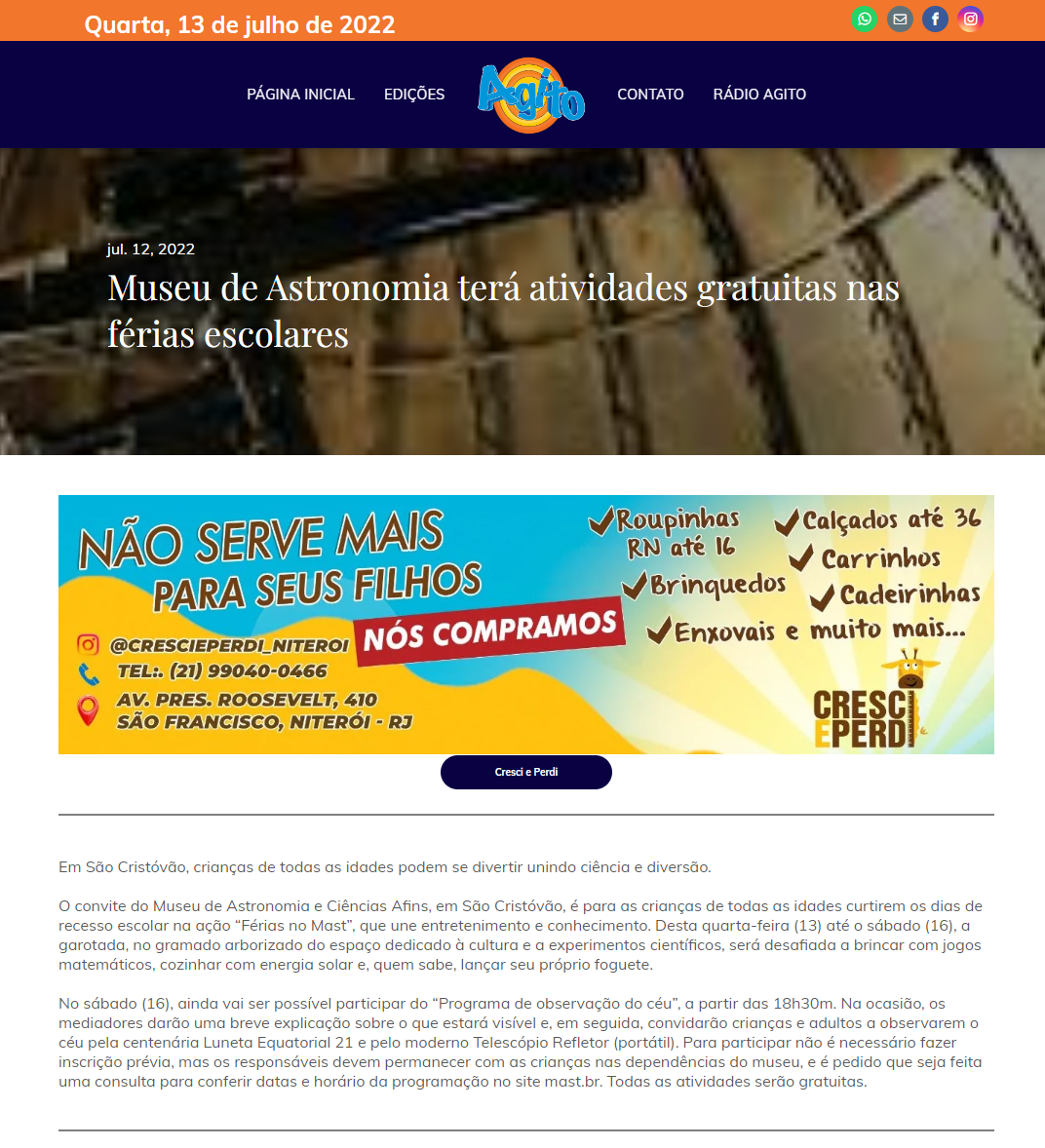 Jornal Agito (Niterói-RJ) - Museu de Astronomia terá atividades gratuitas nas férias escolares