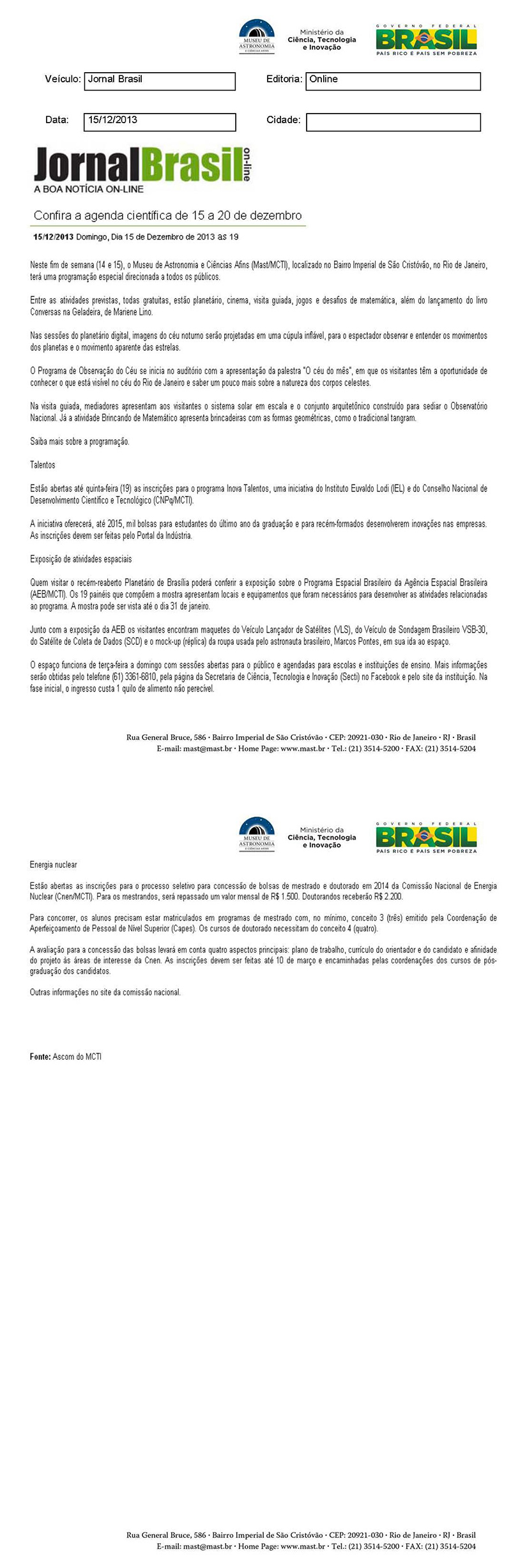 Jornal Brasil | Confira a agenda científica de 15 a 20 de dezembro