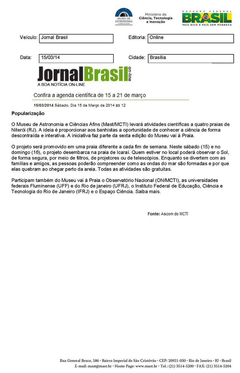Jornal Brasil | Confira a agenda científica de 15 a 21 de março