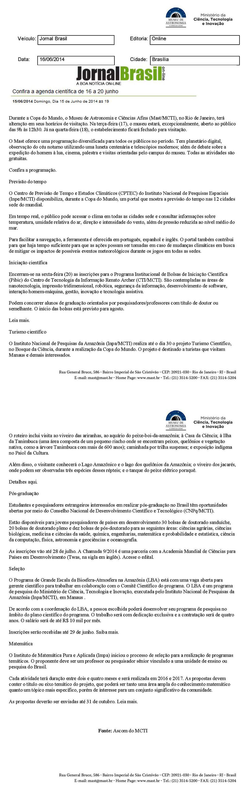 Jornal Brasil | Confira a agenda científica de 16 a 20 de junho