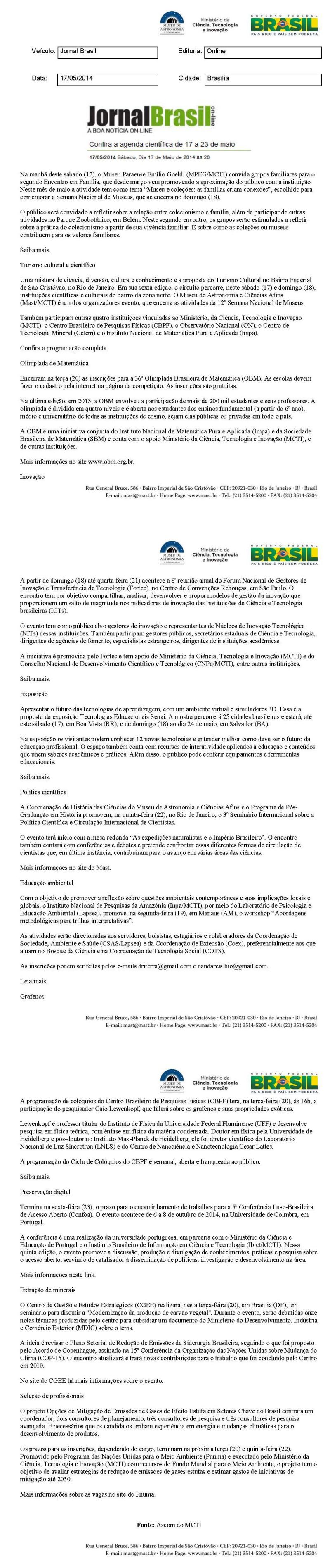 Jornal Brasil | Confira a agenda cientifica de 17 a 23 de maio