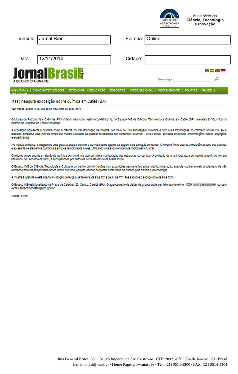 Jornal Brasil | MAST inaugura exposição sobre química em Caetité (BA)