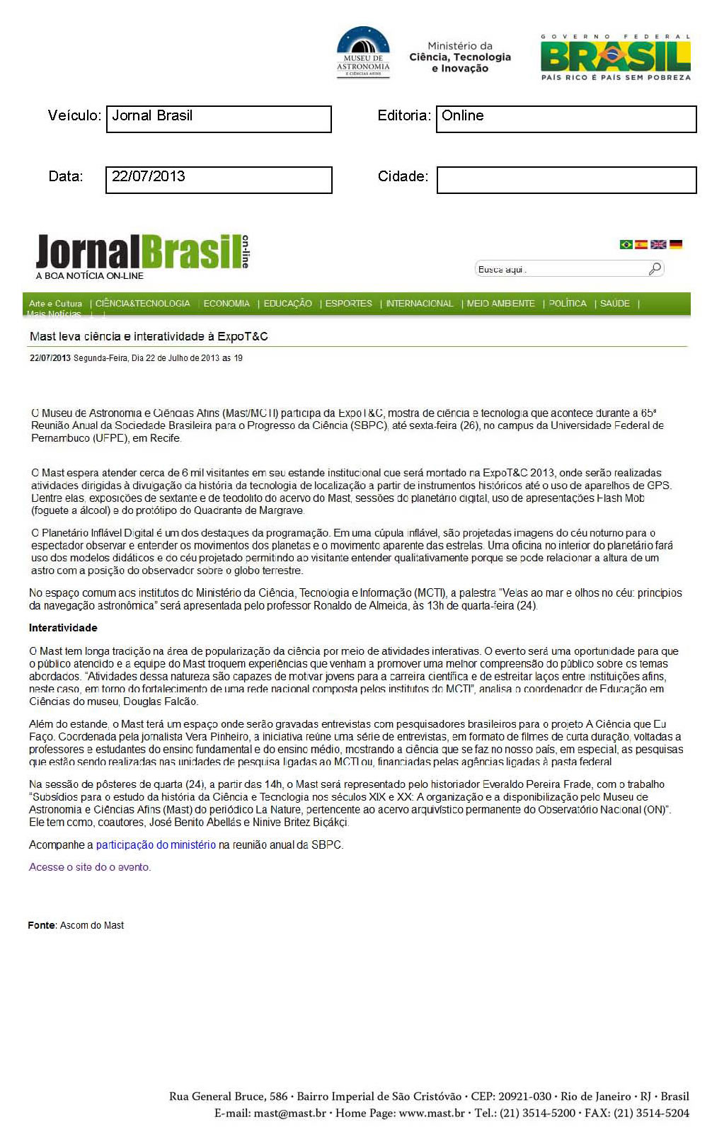 Jornal brasil | MAST leva ciência e interatividade à ExpoT&C