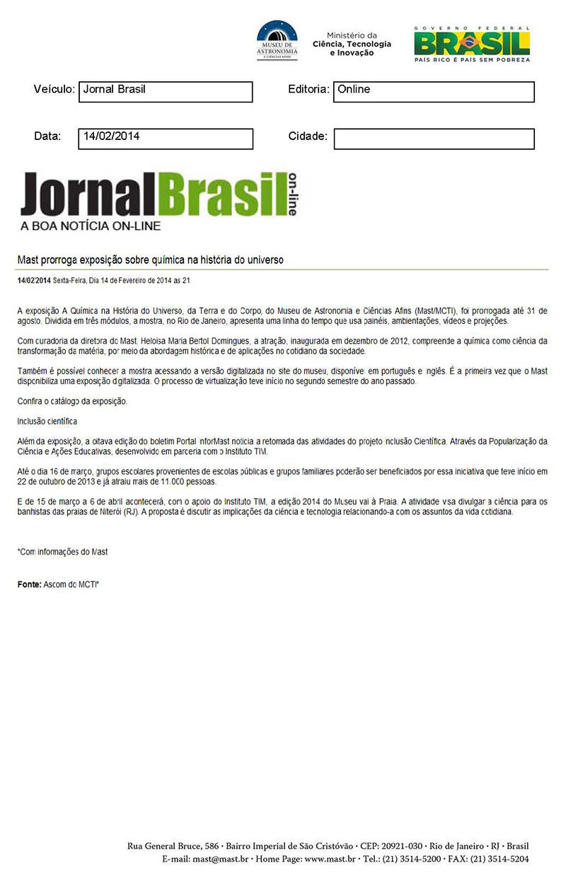 Jornal Brasil | MAST prorroga exposição sobre química na história do universo